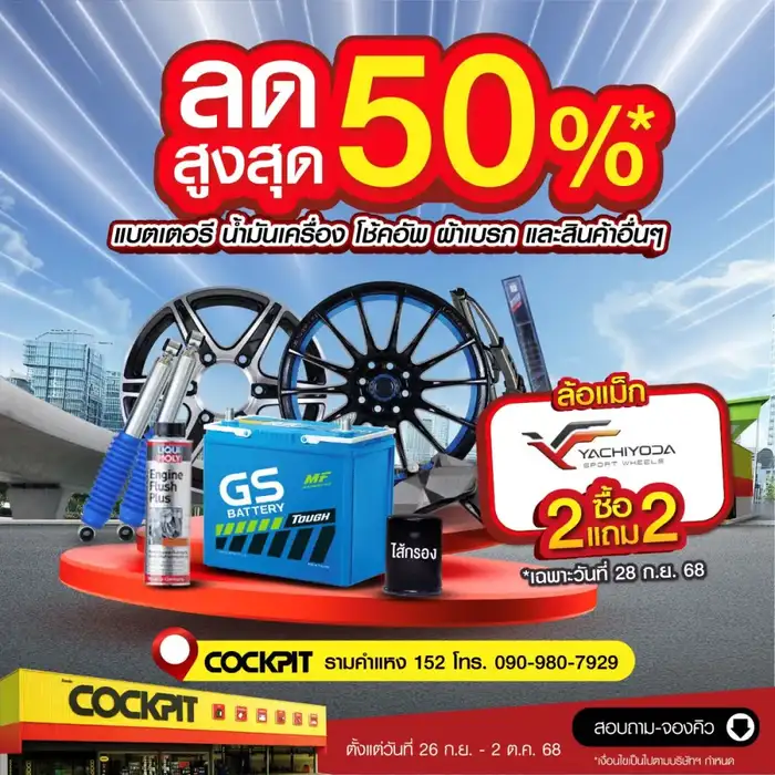 ค็อกพิท (COCKPIT) ศูนย์บริการรถยนต์ครบวงจรฟาสต์ฟิต ภายใต้การบริหารงานของบริษัท บริดจสโตน เอ.ซี.ที (ประเทศไทย) จำกัด รุกขยายสาขาใหม่ในกรุงเทพฯ กับ"ค็อกพิท รามคำแหง 152" ตั้งอยู่ในปั๊มบางจาก ติดปากซอยรามคำแหง 152 บนถนนรามคำแหงขาเข้า ฉลองเปิดสาขาใหม่ด้วยโปรโมชันจัดเต็มพร้อมเสิร์ฟให้คนรักรถเพียบตลอด 7 วันตั้งแต่วันที่ 26 กันยายน 2568 - 2 ตุลาคม 2568 ชวนมาเปลี่ยนยางรถยนต์ BRIDGESTONE, FIRESTONE หรือ DAYTON ทุกรุ่น ทุกขนาดที่ร่วมรายการครบ 3 เส้น แถมฟรีอีก 1 เส้น, ยางรถยนต์แบรนด์ชั้นนำลด 10% และผลิตภัณฑ์ดูแลรถยนต์อื่นๆ อีกมากมาย ลดสูงสุดถึง 50% พิเศษ! สำหรับลูกค้าที่ลงทะเบียนในงาน Grand Opening Day วันที่ 28 กันยายน 2568 ยังสามารถลุ้นรับสิทธิ์ซื้อยางรถยนต์ BRIDGESTONE, FIRESTONE หรือ DAYTON 2 เส้น แถมฟรีอีก 2 เส้น จำนวน 30 สิทธิ์เท่านั้น และส่วนลดอื่นๆ อีกมากมาย พบกับกิจกรรมร่วมสนุกลุ้นรับของรางวัลได้ภายในงาน แวะค็อกพิทที่เดียว ครบ จบ คุ้ม เรื่องการดูแลรถยนต์ของคุณ