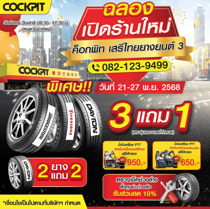 ค็อกพิท (COCKPIT) ศูนย์บริการรถยนต์ครบวงจรฟาสต์ฟิต ภายใต้การบริหารงานของบริษัท บริดจสโตนเซลส์ (ประเทศไทย) จำกัด ฉลองเปิดสาขาใหม่ “ค็อกพิท เสรีไทยยางยนต์ 3” ตั้งอยู่ภายในปั๊มน้ำมันบางจาก บริเวณห้าแยกน้ำกระจาย ตรงข้ามไทวัสดุ จังหวัดสงขลา พร้อมยกขบวนโปรโมชันจัดเต็มเอาใจชาวสงขลาและพื้นที่ใกล้เคียง ตั้งแต่วันที่ 21 พฤศจิกายน 2568 - 27 พฤศจิกายน 2568 พลาดไม่ได้! เมื่อซื้อยางรถยนต์ BRIDGESTONE, FIRESTONE หรือ DAYTON รุ่นและขนาดที่ร่วมรายการครบ 3 เส้น แถมฟรี 1 เส้น และผลิตภัณฑ์ชั้นนำดูแลรถยนต์อื่นๆ โดนใจอีกมากมาย มาที่เดียว ครบ จบ ทุกเรื่องรถ