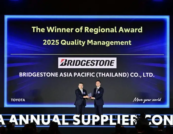 บริดจสโตน ผู้นำนวัตกรรมยางรถยนต์พรีเมียม คว้า 2 รางวัลทรงเกียรติจากผลการดำเนินงานดีเด่นประจำปี พ.ศ. 2568 ได้แก่ “รางวัล The Winner of 2025 Regional Supplier Outstanding Performance ประเภท Quality Management” มอบให้แก่บริษัท บริดจสโตน เอเชีย แปซิฟิค (ประเทศไทย) จำกัด และ “รางวัล TCC Safety Activity 2025 The Best Safety Award” มอบให้แก่บริษัท ไทยบริดจสโตน จำกัด ในงานประกาศรางวัล “2026 TMA Annual Supplier Conference” ซึ่งจัดขึ้นโดยบริษัท โตโยต้า มอเตอร์ เอเชีย (ประเทศไทย) จำกัด เพื่อยกย่องซัพพลายเออร์ที่มีผลงานดีเด่น และผ่านเกณฑ์ทั้งภายในประเทศและทั่วภูมิภาคเอเชีย ณ โรงแรมเซ็นทารา ไลฟ์ ศูนย์ราชการและคอนเวนชันเซ็นเตอร์ แจ้งวัฒนะ