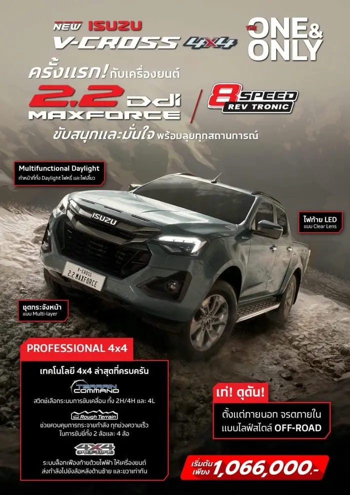 NEW! ISUZU V-CROSS 4×4 “THE ONE & ONLY” เครื่องยนต์ 2.2 Ddi MAXFORCE 4 ประตู ในราคาเริ่มต้น 1,066,000 บาท เปิดมิติใหม่สายออฟโรดด้วยขุมพลังดีเซลเจเนอเรชันล่าสุด ให้การตอบสนองฉับไว ส่งกำลังต่อเนื่องผ่านเกียร์อัตโนมัติ 8 สปีดแบบ REV TRONIC ขับสนุก คล่องตัว และประหยัดน้ำมัน รองรับทั้งงานหนักและไลฟ์สไตล์ผจญภัย ต่อยอด DNA ความแกร่งทนทานของอีซูซุกว่า 50 ปี มาพร้อมดีไซน์ดุดัน แบบฉบับ V-CROSS กระจังหน้า Multi-layer