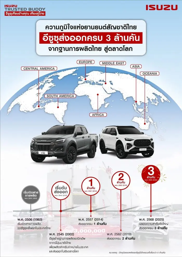 ISUZU ส่งออกดีแมคซ์ และ มิว-เอ็กซ์ ที่ผลิตจากไทยไปตลาดโลกครบ 3 ล้านคัน ยืนยันคุณภาพมาตรฐานระดับโลก ตอกย้ำศักดิ์ศรีการเป็น "โปรดักแชมเปี้ยน" ที่สร้างมูลค่าทางเศรษฐกิจและภาพลักษณ์อันแข็งแกร่งให้ไทย
