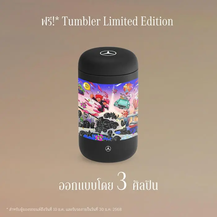และสำหรับลูกค้าที่จองรถยนต์เมอร์เซเดส–เบนซ์ ทุกรุ่น ในงาน จะได้รับกล้อง Mercedes-Benz Drive Recorder 360° มูลค่า 16,500 บาท* และของสมนาคุณสุดพิเศษ Tumbler Limited Edition ที่ออกแบบโดยศิลปินรุ่นใหม่ทั้ง 3 ท่าน ได้แก่ “Jeff Aphisit” “Bomfha” และ “MR.HALFMAN”