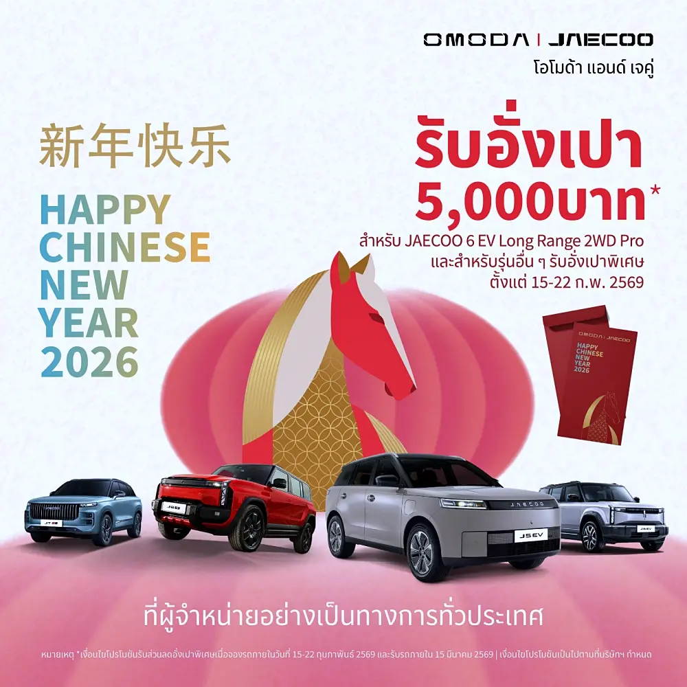 ความเคลื่อนไหวล่าสุดจากวงการยานยนต์ไฟฟ้า เมื่อทาง OMODA & JAECOO แบรนด์รถยนต์นวัตกรรมพรีเมียม ได้ประกาศแคมเปญใหญ่ต้อนรับเทศกาลตรุษจีนปี 2569 โดยมุ่งเน้นการส่งมอบความคุ้มค่าให้กับผู้บริโภคชาวไทย ด้วยข้อเสนอพิเศษทั้งส่วนลดและ "อั่งเปา" เพิ่มเติม หวังกระตุ้นตลาดรถ EV ในช่วงต้นปี